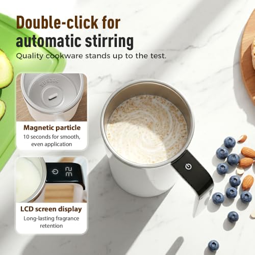 electric automatic magnetic stirring coffee mugOne Touch Automatic Stirring:Self stirring coffee mug featuring a built in magnetic bead, simply double-click the handle button to start stirring. Within 20 seconds, your coffee, protein shakes, or other beverages are mixed smoothly and evenly no clumps, no manual stirring required.